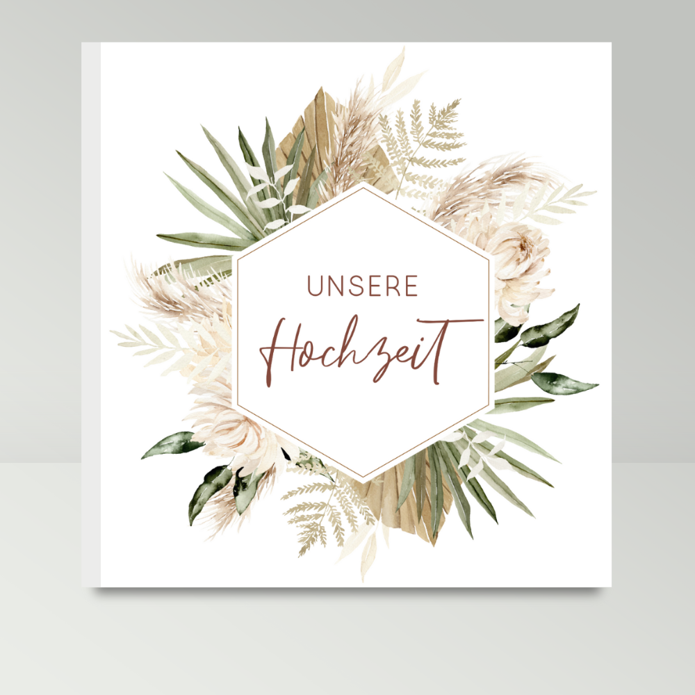 ❤ Das Cover des Gästebuchs ist im modernen Boho-Design und passend für jede Hochzeit, die auf natürliche Elemente setzt.